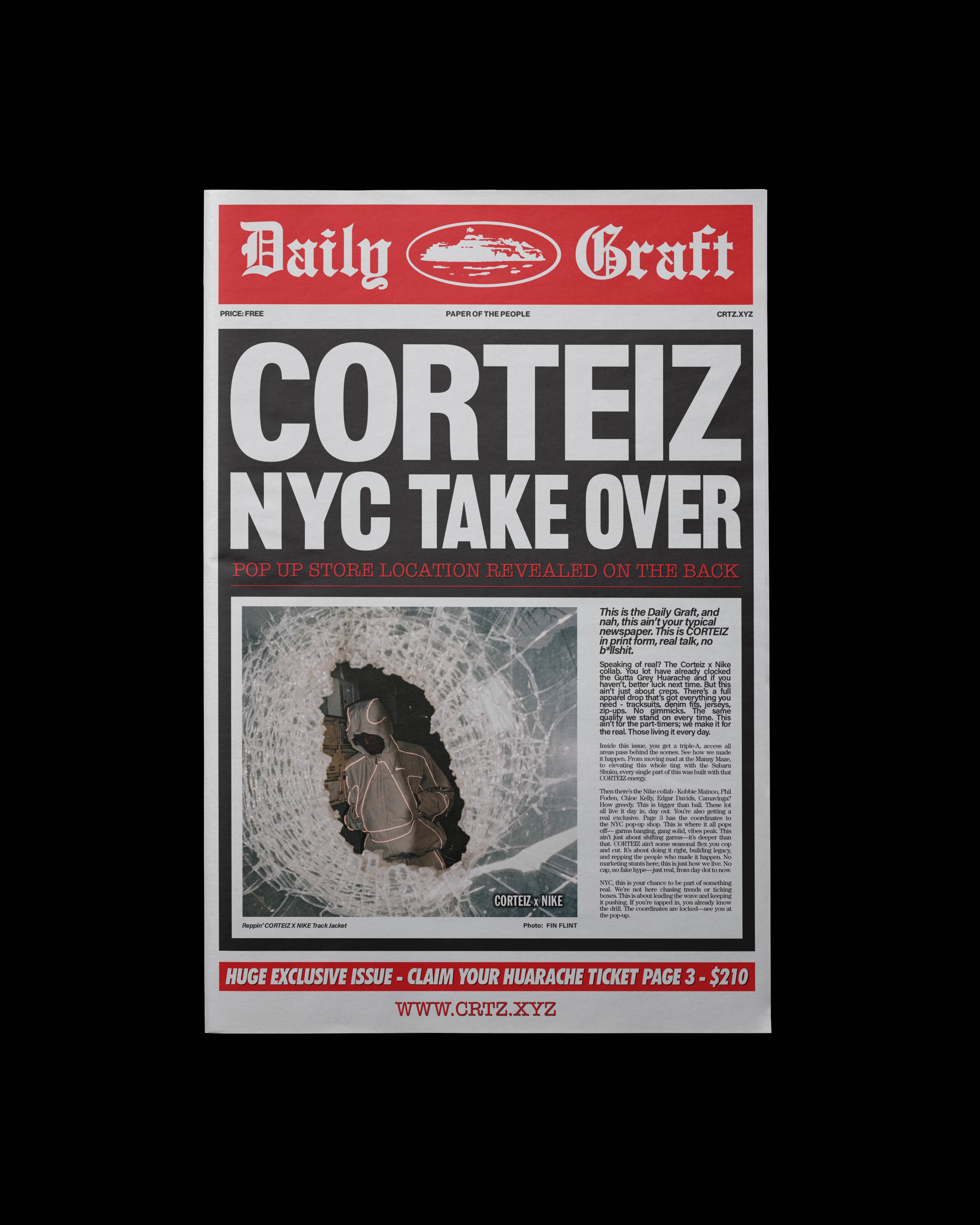 To mark the Corteiz x Nike Air Trainer Huarache release in New York City, we collaborated with Amelia Studios to create a limited-edition tabloid newspaper rooted in street-level storytelling. Featuring an interview with Clint and the stories behind Corteiz, the piece tapped into the raw energy and subcultural legacy of the city. Styled as a guerrilla drop, the editorial combined lo-fi layouts, gritty street photography, and tactile finishes to create a physical artefact that blurs the lines between fashion, culture, and rebellion, capturing the spirit of both brands and the chaos of the Big Apple.